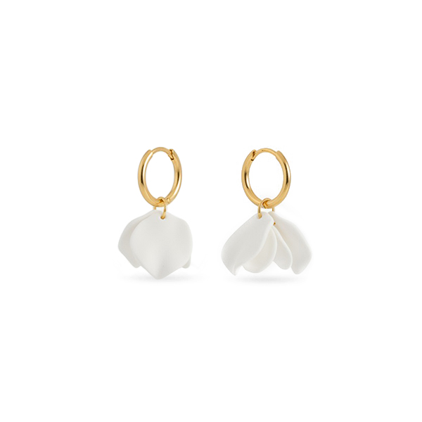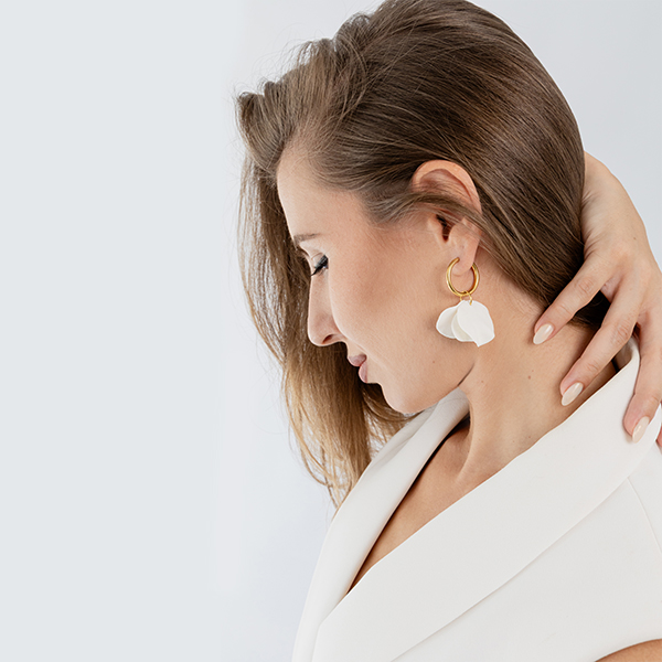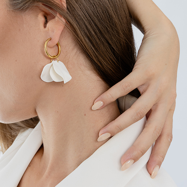 Елегантни и нежни, с дизайн, вдъхновен от формата на цветни листенца. Изработени от неръждаема стомана, която не променя цвета си, и фини ръчно моделирани елементи. Леки върху ухото и универсални.
